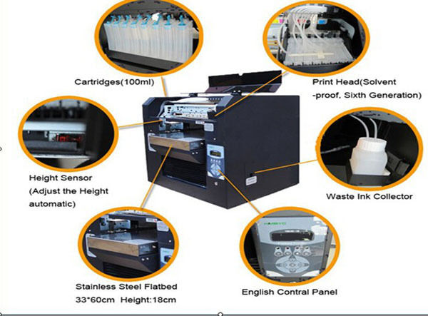 Tätä tulostinta voidaan käyttää lähes kaikenlaisten materiaalien tulostamiseen, kuten T-paita, CD, kortti, kynä, golfpallo, puhelinkotelo, USB, lasi, muovi, akryyli, PVC, nahka, marmori, metalli, puu, pullo jne.